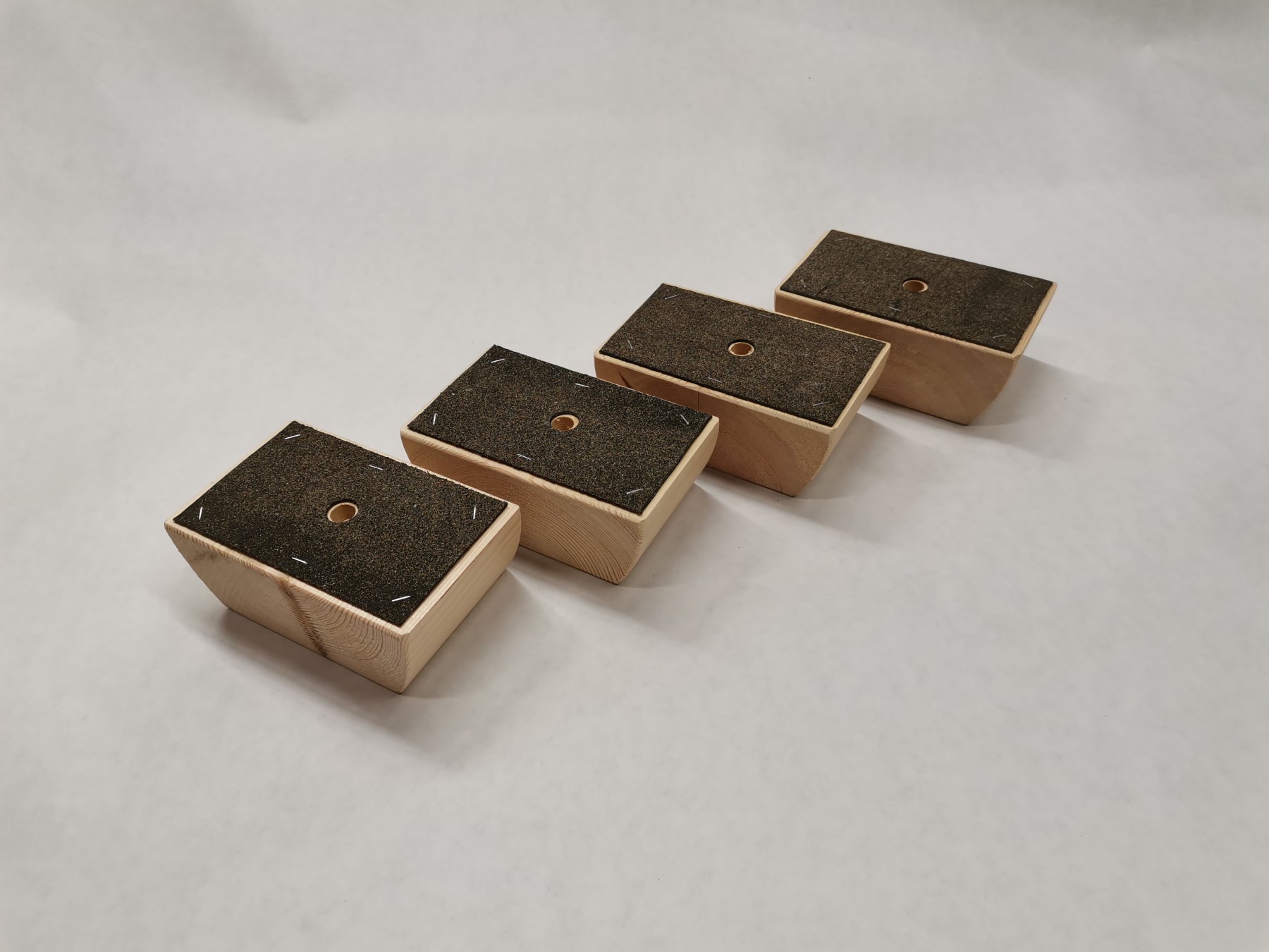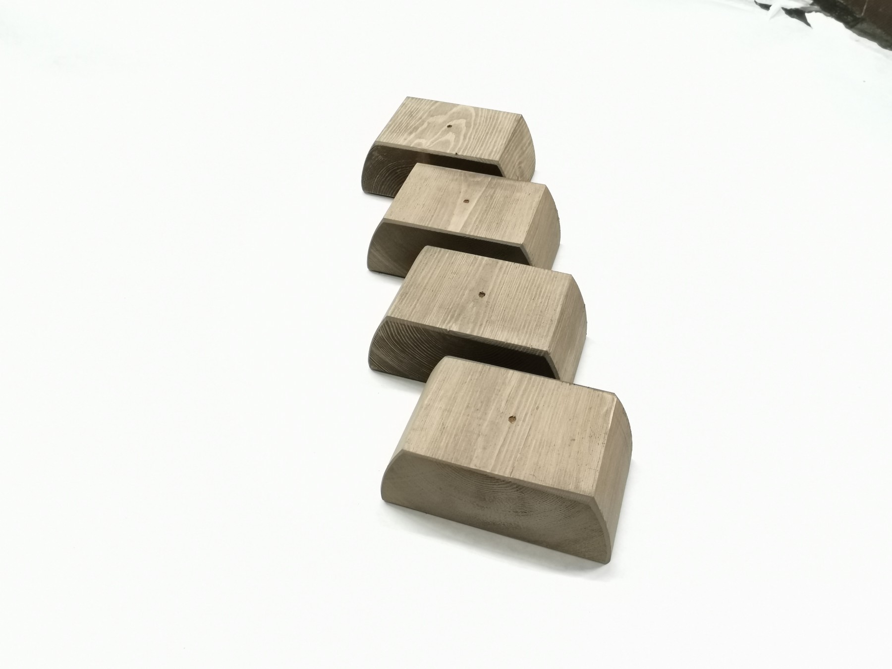Kalusteen alle ruuvattavat aluspalat, joiden pohjassa on vedenkestävällä liimalla liimattu huopakaistale lisäämään aluspalan kestävyyttä. Käsitellään pohjusteella. Ostettaessa kalusteen kanssa laitetaan aluspaloihin sama pintakäsittely.